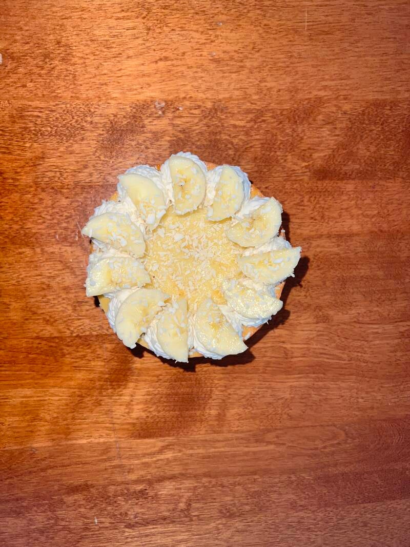 Above here is a beautiful small banana coconut cheesecake, with banana and coconut flavoring in the filling and banana slices with coconut flakes on top